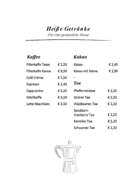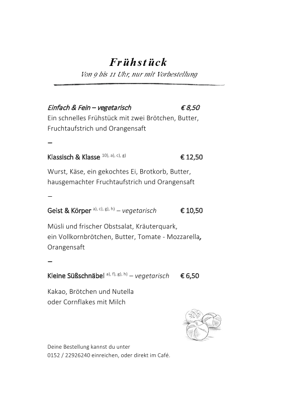 The menu at Cafe Ponte is thoughtfully curated, focusing on homemade delights that cater to a variety of tastes. For breakfast, the "Einfach & Fein" with two fresh rolls, butter, fruity spread, and a glass of orange juice is a delightful start to your day at just €8.50. If you prefer a classic option, the "Klassisch & Klasse" features a selection of cheeses, meats, a boiled egg, freshly baked bread, and homemade jam for €12.50, making it ideal for those who enjoy a hearty, traditional meal. Vegetarians will appreciate the "Geist & Körper," which offers a refreshing muesli and fresh fruit salad, alongside whole grain rolls and creamy herb quark for €10.50.